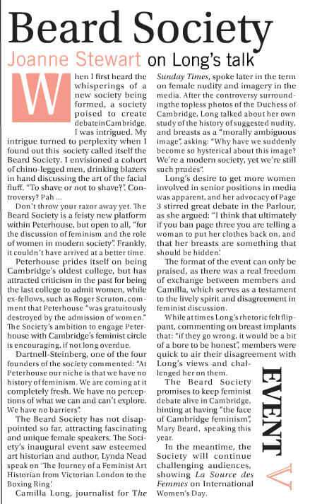 Since its inception, the Beard Society has prided itself in presenting a vast range of speakers without ceding nuance. In the past we have hosted talks on feminist poetry, body image and the female nude, as well as more niche topics, such as medieval attitudes towards menstruation. Our guests have included: representatives from the Focus E15 Campaign fighting for affordable housing in London; politician and trans activist Sarah Brown; academic and Peterhouse Fellow Dr Jennifer Wallace; and artist and founding member of the London Drawing Group Luisa-Maria MacCormack.